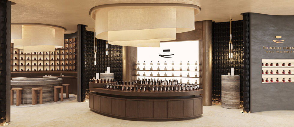 The material palette combines warm oak, brushed brass, and softly veined stone, chosen for their tactility and timeless presence. Subtle LED details illuminate the fragrances like treasures, while the lounge seating invites guests to pause, explore, and connect with each scent on a personal level.