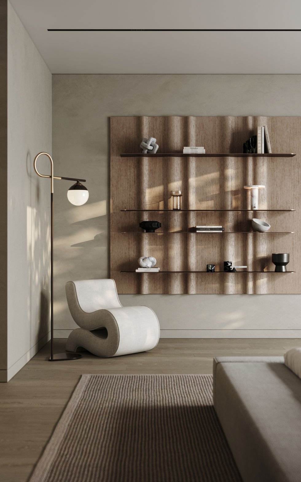 In the reading nook, a sculptural lounge chair and floating shelves introduce a sense of curation—functional yet artistic. The palette of warm wood, textured fabrics, and muted neutrals ensures the room feels serene, grounded, and timeless.